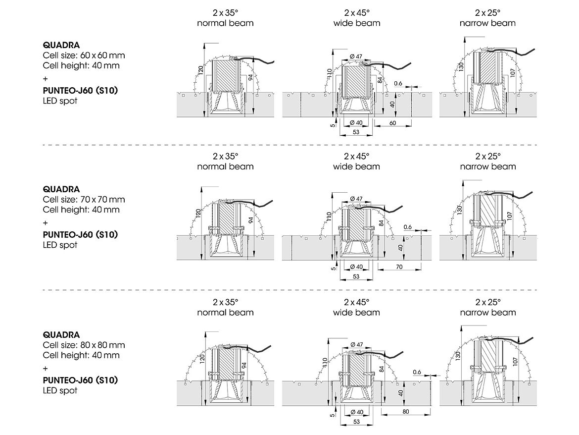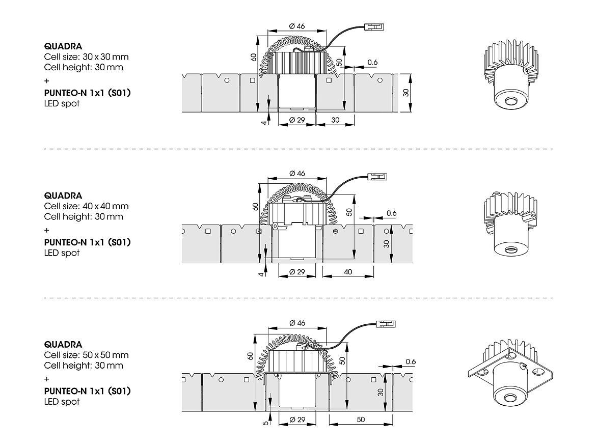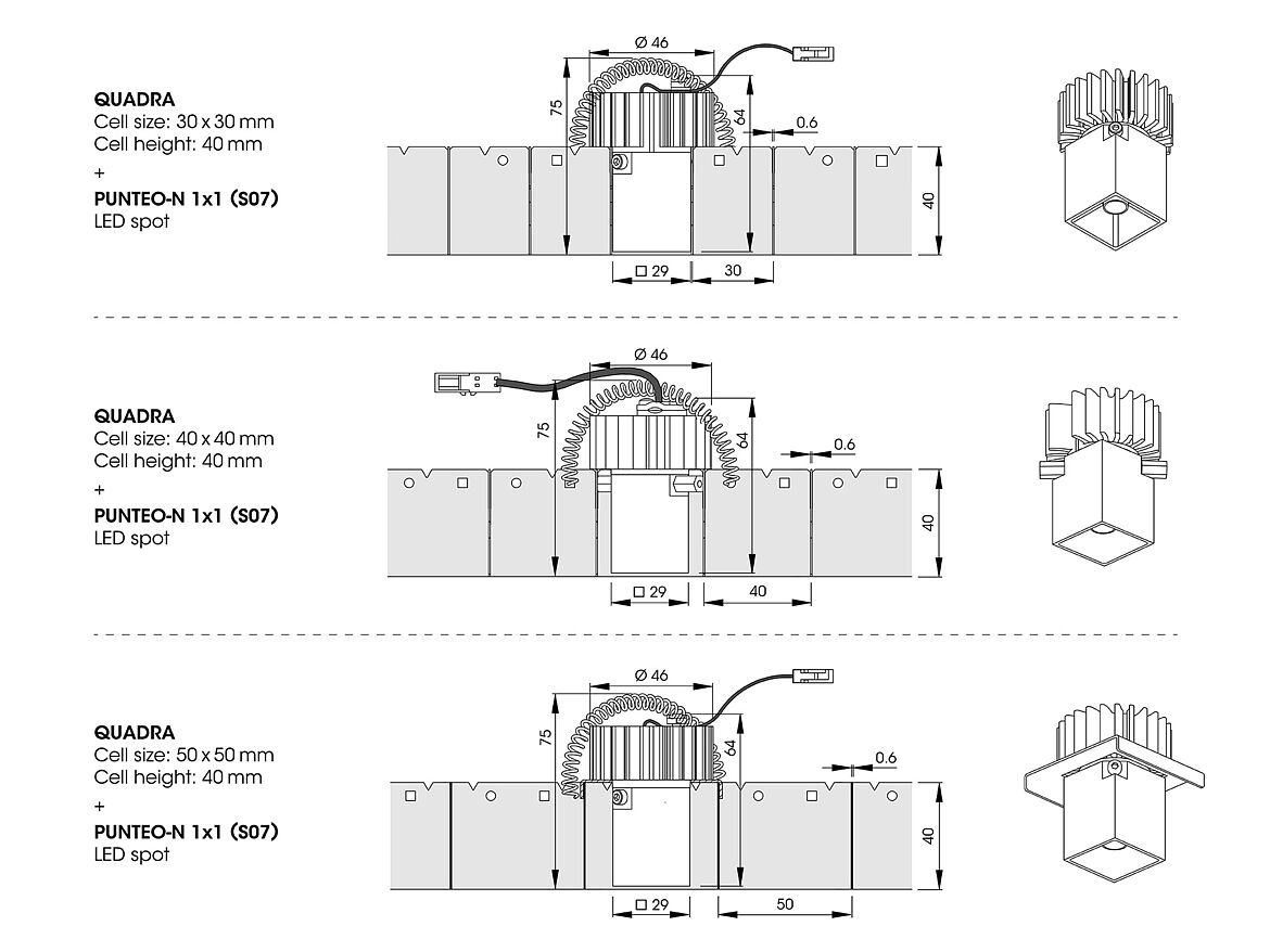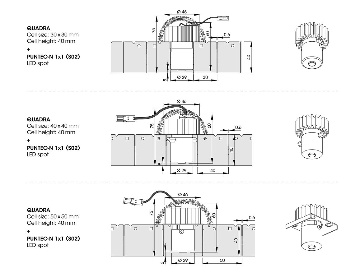 PUNTEO-N 1x1 ist eine hocheffiziente LED-Einbauleuchte, die durch exzellente Entblendung und maximalen Lichtaustritt bei gleichzeitig hoher Energieeinsparung überzeugt. Das Downlight lässt sich bei Zellgrößen von 30x30mm, 40x40mm und 50x50mm passgenau in die offene Decke QUADRA integrieren, sodass der Leuchtenkörper quasi unsichtbar ist (Produktfinder). Bei Zellgrößen von 60x60mm, 70x70mm und 80x80mm lässt sich das moderne PUNTEO-J60 LED-Downlight optimal in QUADRA integrieren. Dank ihrer Lichttechniken sorgen beide Leuchten für eine ideale und effiziente Ausleuchtung unterschiedlichster Raumsituationen.