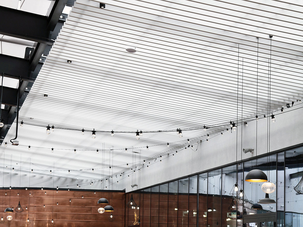 Lamellendecke: Verzinktes Stahlblech (Standard), weiß pulverbeschichtet (RAL 9016 matt).