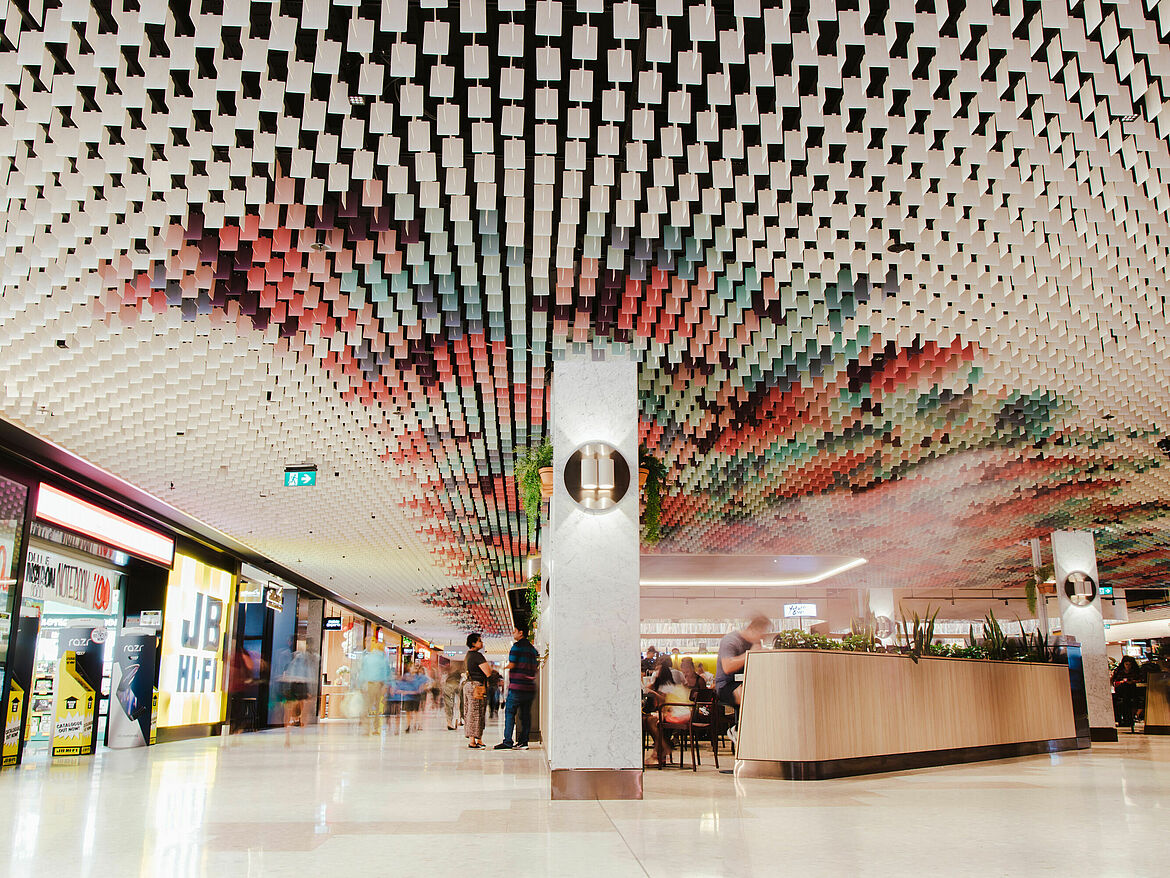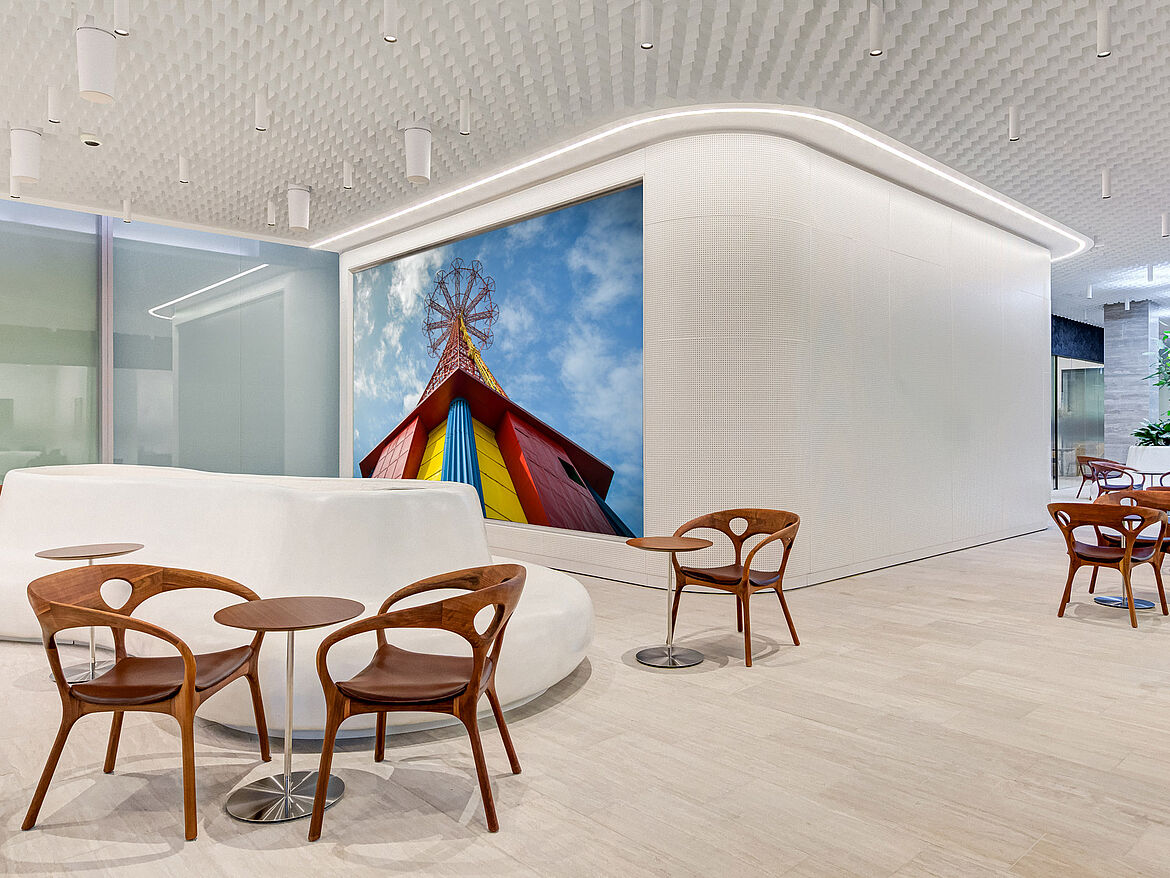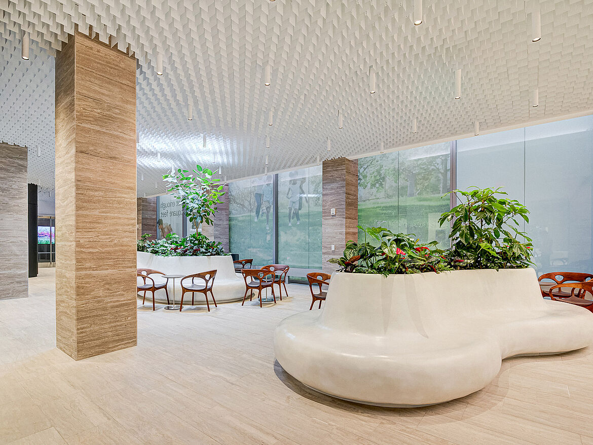 Das multidirektionale Raster LIVA überzeugt mit einem luftigen, homogenen Erscheinungsbild. In unterschiedlichen Höhen kombinierbar, bieten die rechtwinklig zueinander angeordneten Blattlamellen aus Aluminium viele Gestaltungsmöglichkeiten. Dadurch entsteht ein dynamisches Deckenbild, mit dem individuelle Akzente gesetzt werden können.