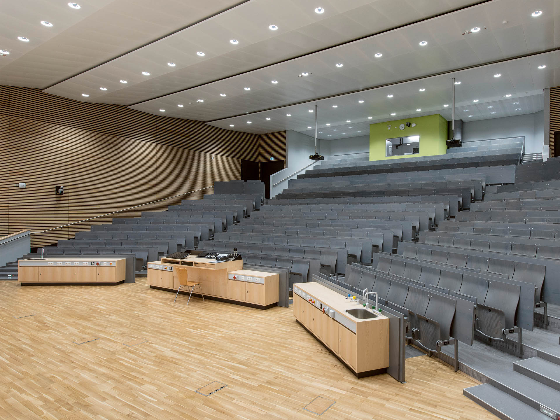 For lecture theatres, DIN EN 12464-1 stipulates a minimum illuminance of 500 lux, although 750 lux is recommended. In the lecture and presentation area, the illuminance should even be between 750 lux and 1,000 lux.