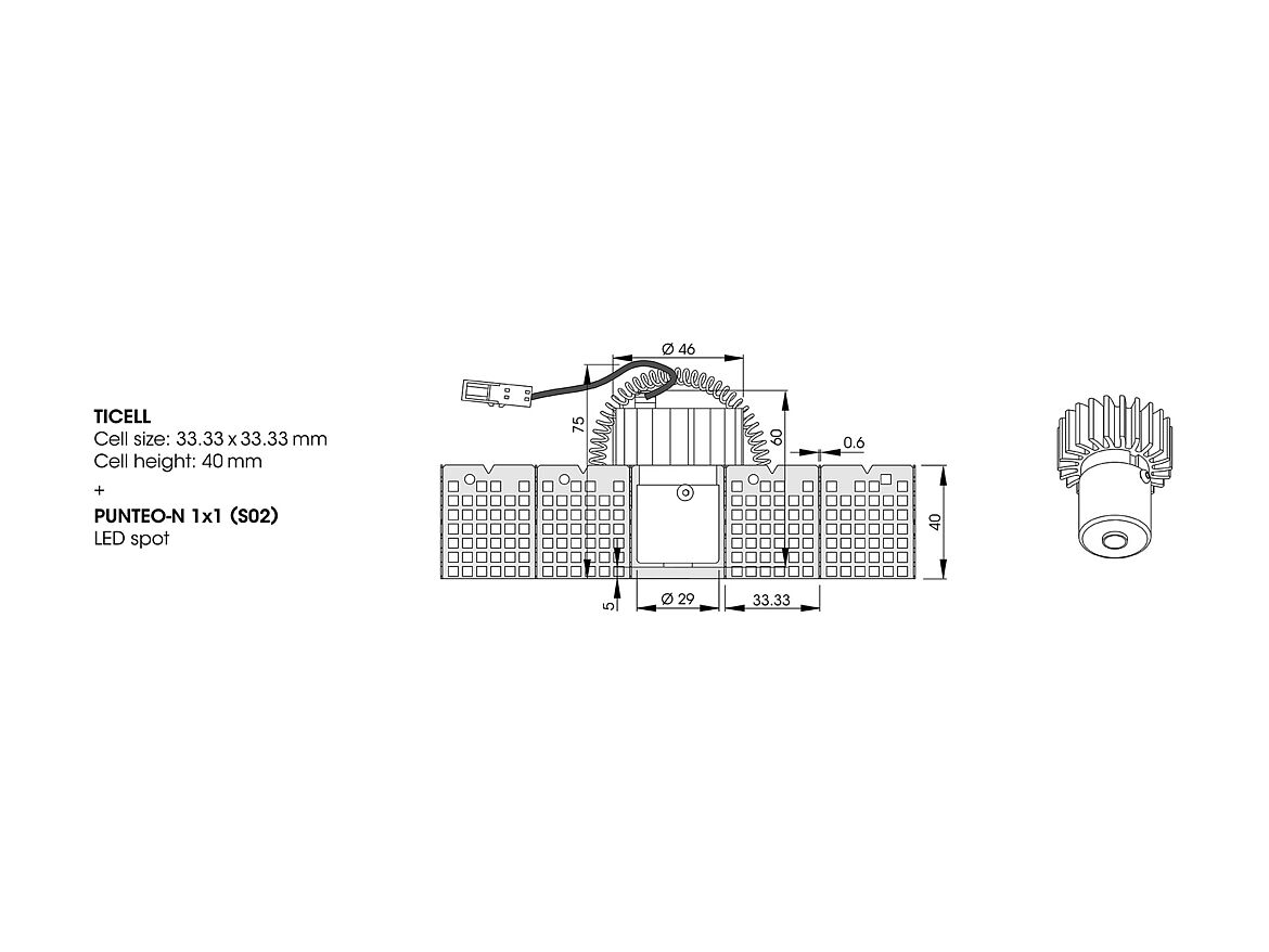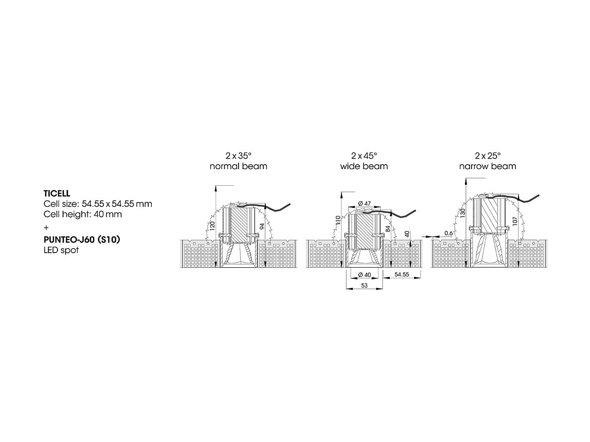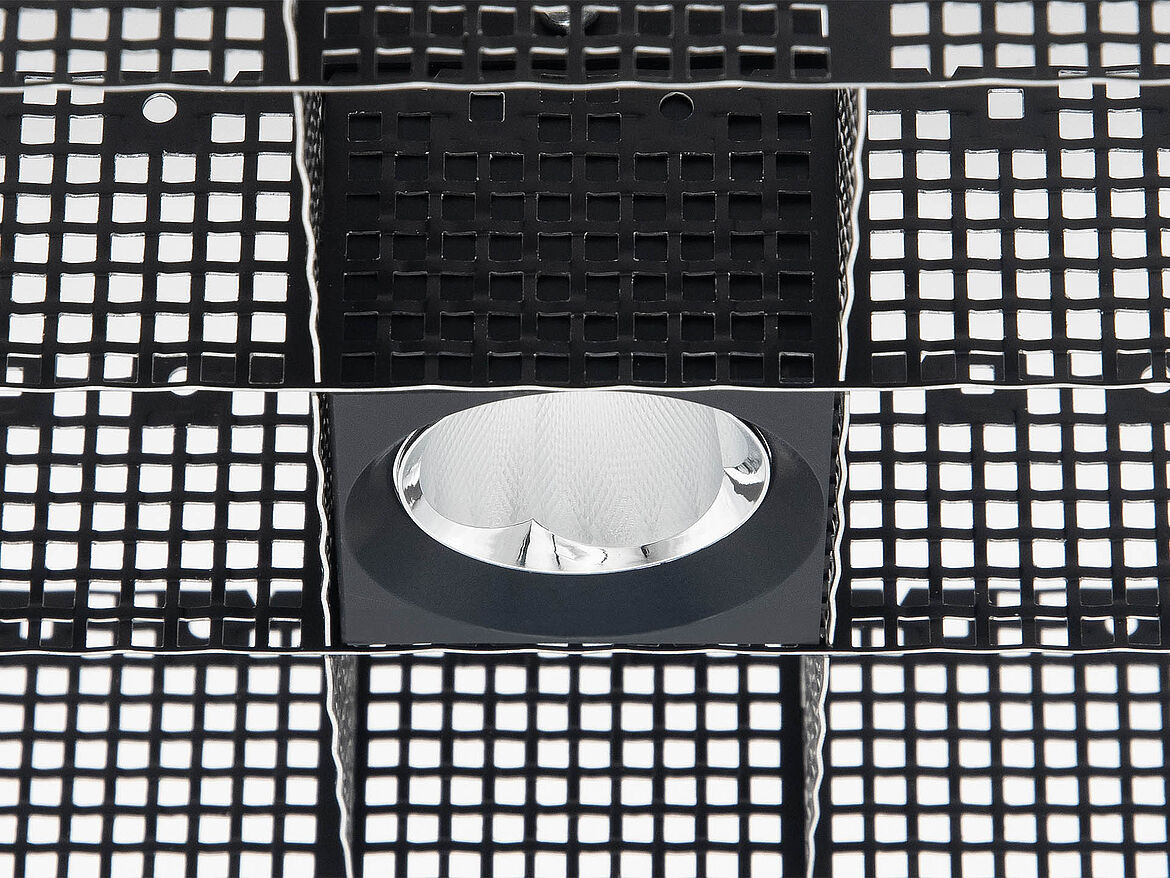 The PUNTEO-N 1x1 is a highly efficient recessed luminaire that impresses with its excellent glare control, maximum light output and high energy savings. The downlight can be neatly integrated into the open-cell ceiling TICELL with a cell size of 33.33 x 33.33 mm, making the luminaire body almost invisible (product finder). With a cell sie of 54.55 x 54.55 mm the modern PUNTEO-J60 downlight can be optimally integrated into the TICELL ceiling. Thanks to their lighting technology, both luminaires provide ideal, efficient illumination for a wide variety of room situations.