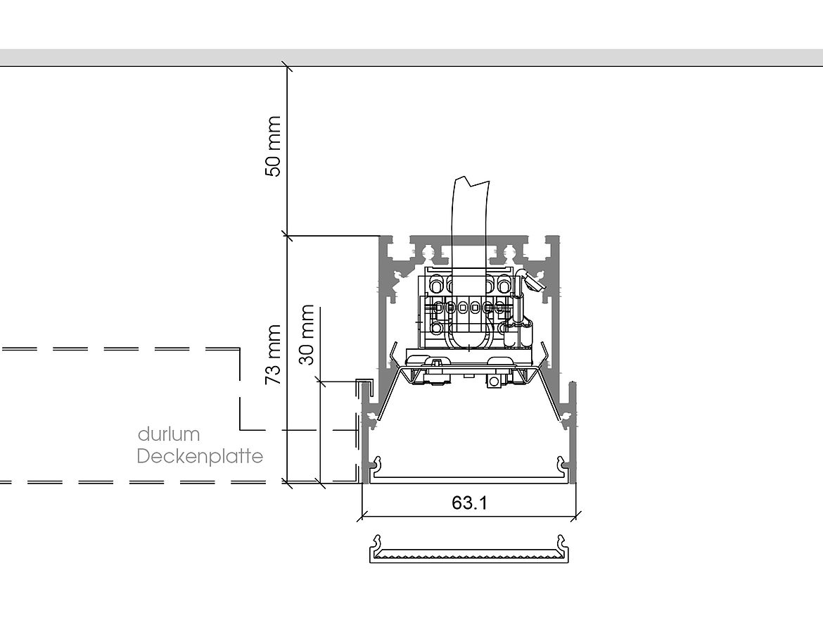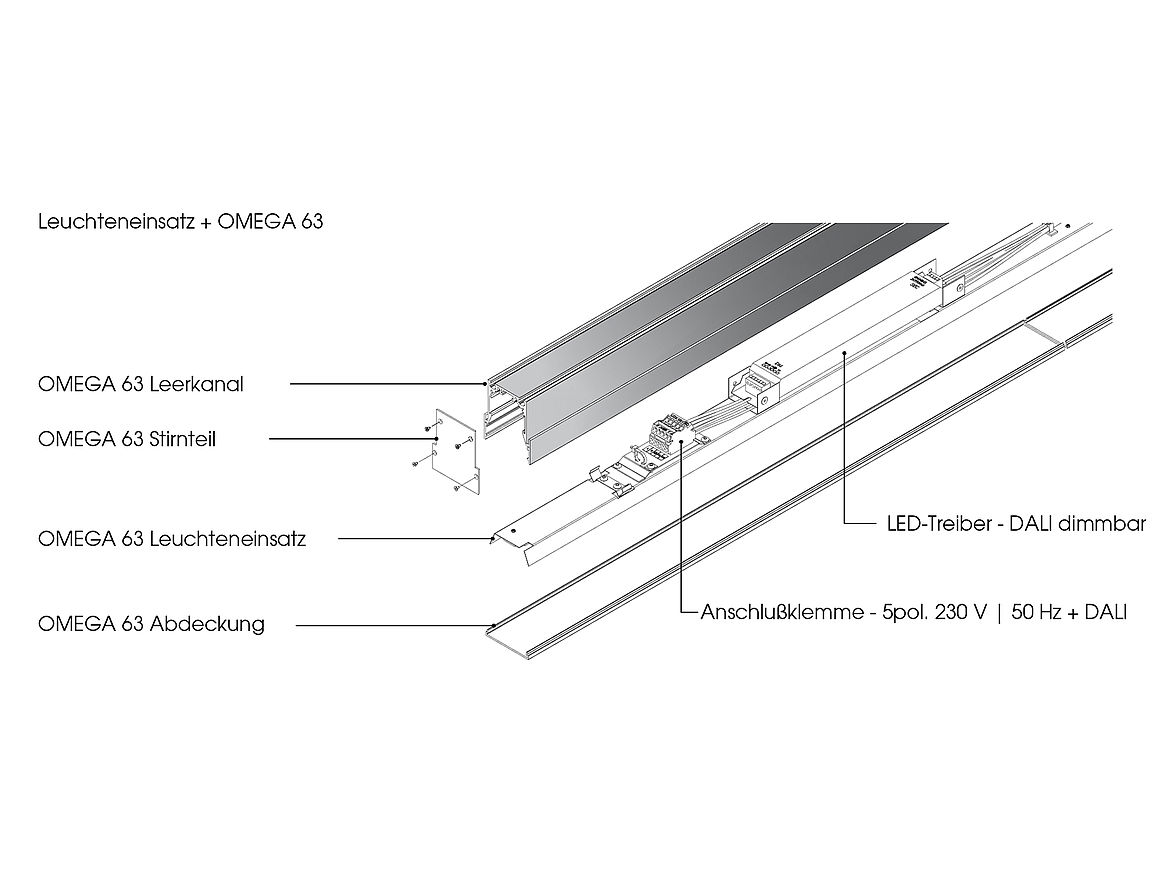 There are many design options with OMEGA 63. This slim design line comprises a symmetrically radiant aluminium lighting channel system with LED technology. Alternatively, OMEGA 63 can also be designed asymmetrically as a wall washer to allow the walls to be lighted evenly. The lighting channel is based on a stable basic profile with lengths of up to 6 m.