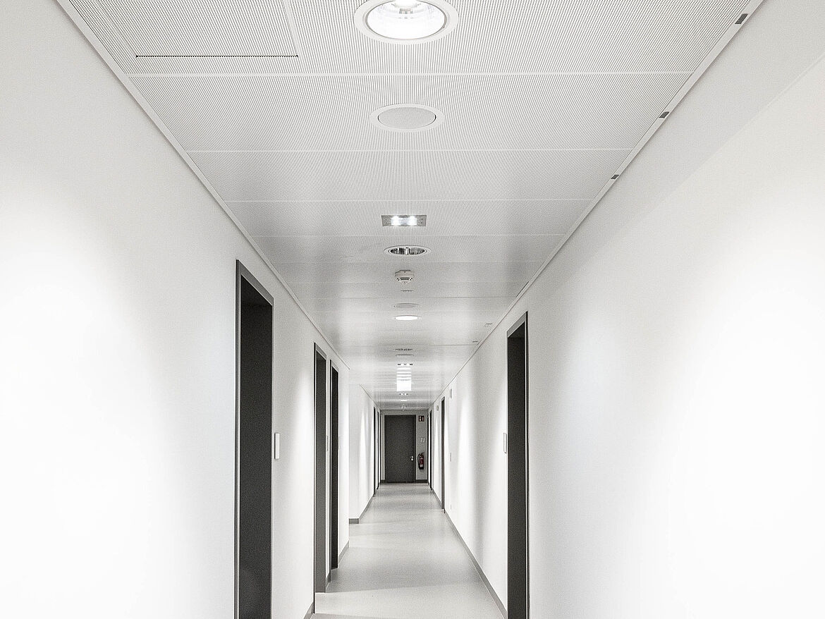The two metalceiling systems FF025 and FF2025 are specifically suited to vestibules. They are distinguished visually by a slight height offset between panel and visible, F-shaped perimeter trims. Optionally, the vestibule system can be provided with a visible shadow gap (FF2025). The substructure is visible on the insert systems.