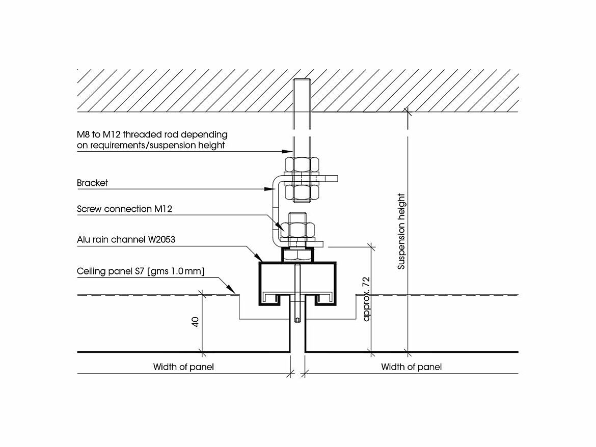 Maximum suspension height with M12 threaded rod: 500 mm - Square = 950 x 950 mm; suspension W2053 every 600 mm and maximum Suspension height with M12 threaded rod = 500 mm
